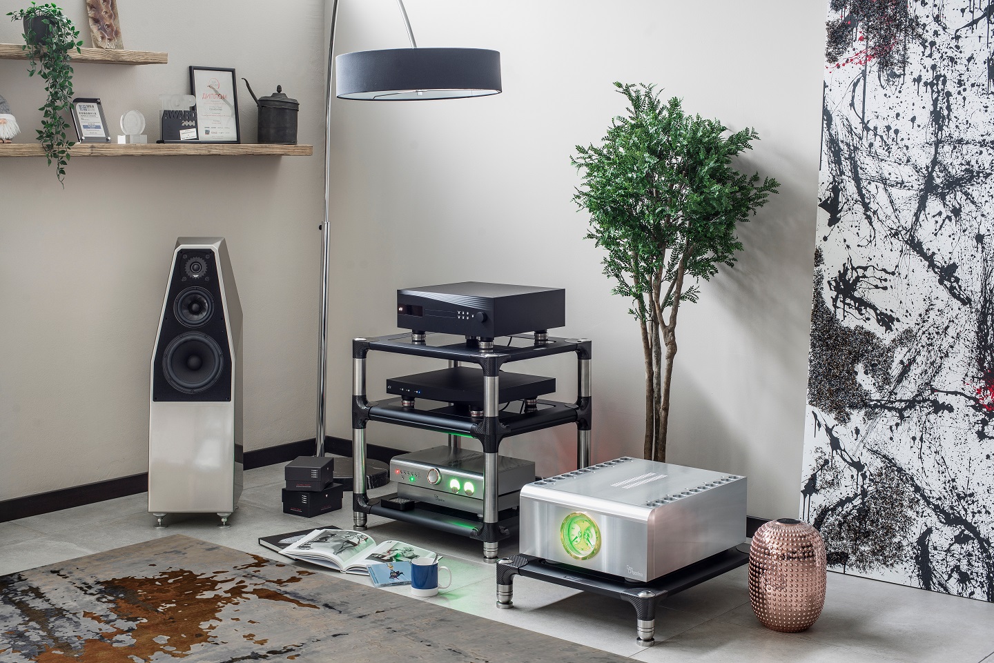 Modüler yapı: İhtiyaca göre raf sayısı ve yükseklik ayarlanabilir; farklı hi-fi cihazlara (amfi, DAC, streamer, pikap vb.) uyum sağlar.
